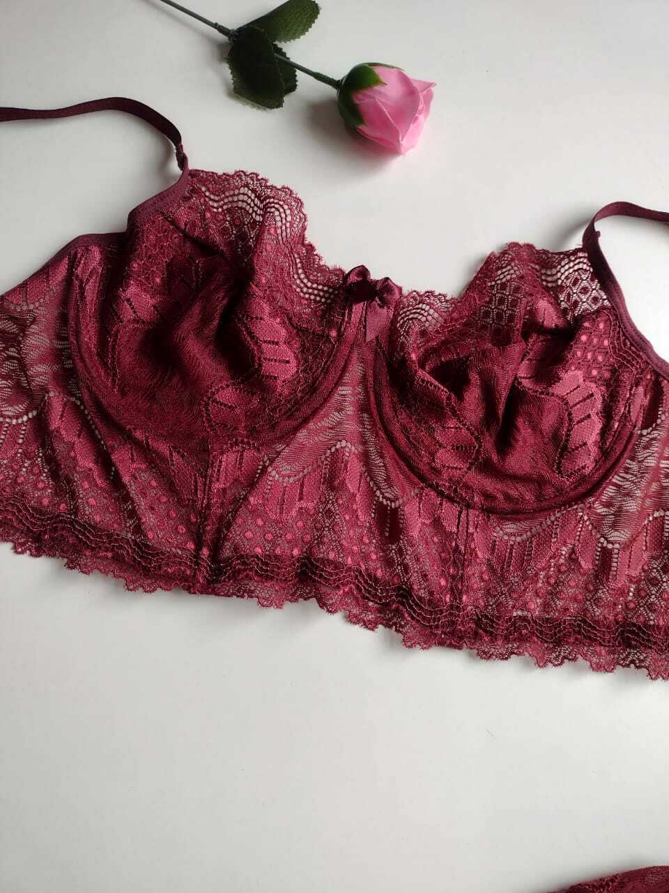 Conjunto vinho, modelo delicado de renda vem trazendo sofisticação e delicadeza.