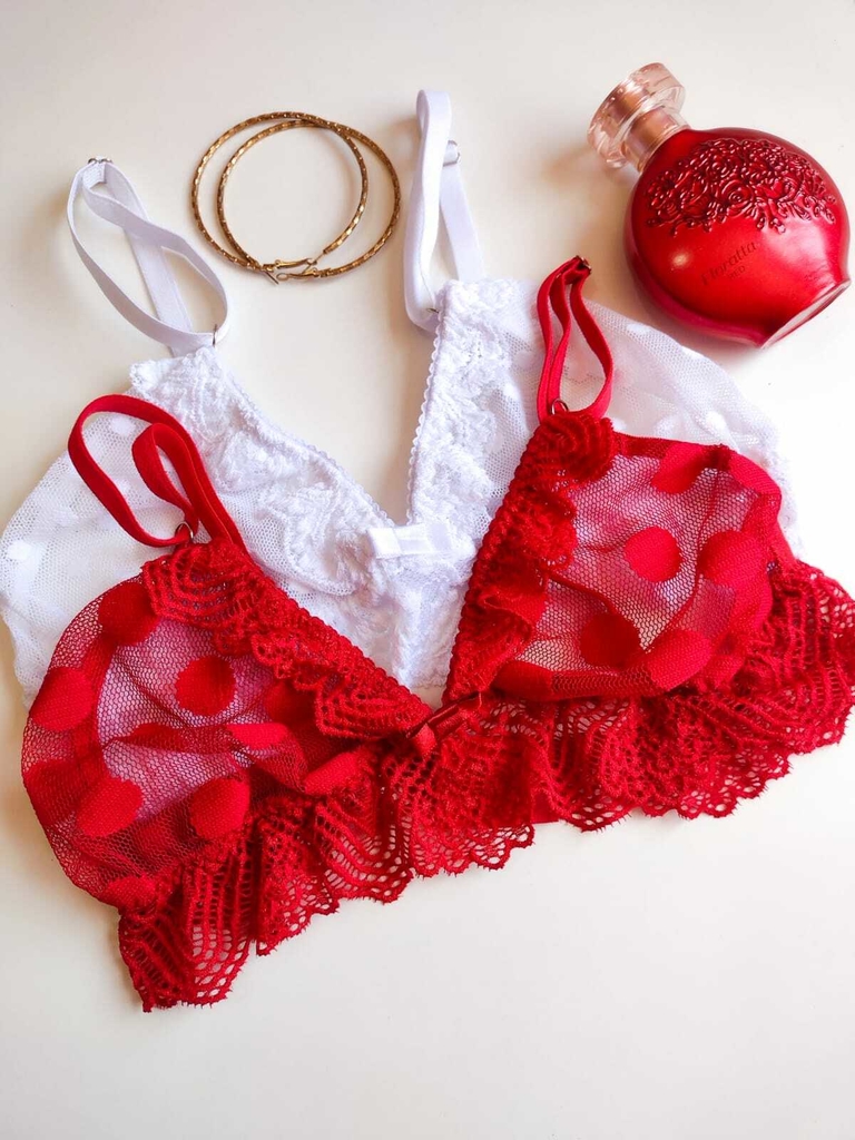 Sutiã Aurora todo trabalhado na renda e no tule, com detalhes em bolinhas. Sem forro, possui alças reguláveis e muita elasticidade. Nas cores Vermelho e no Branco.